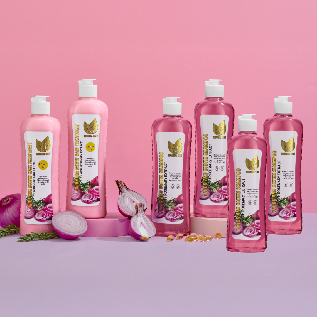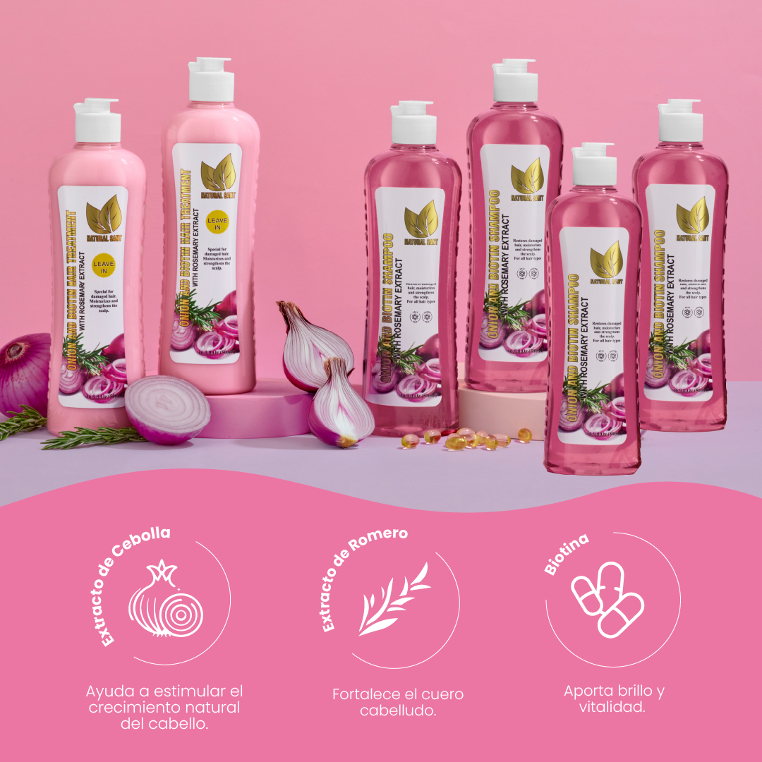 Shampoo: el shampoo de cebolla, romero y biotina es un restaurador e hidratante de cabellos dañados, ideal para todo tipo de cabello. Los extractos naturales de la cebolla, el romero y la biotina ayudan a fortalecer el cuero cabelludo, promover el crecimiento natural del cabello y aportar brillo.