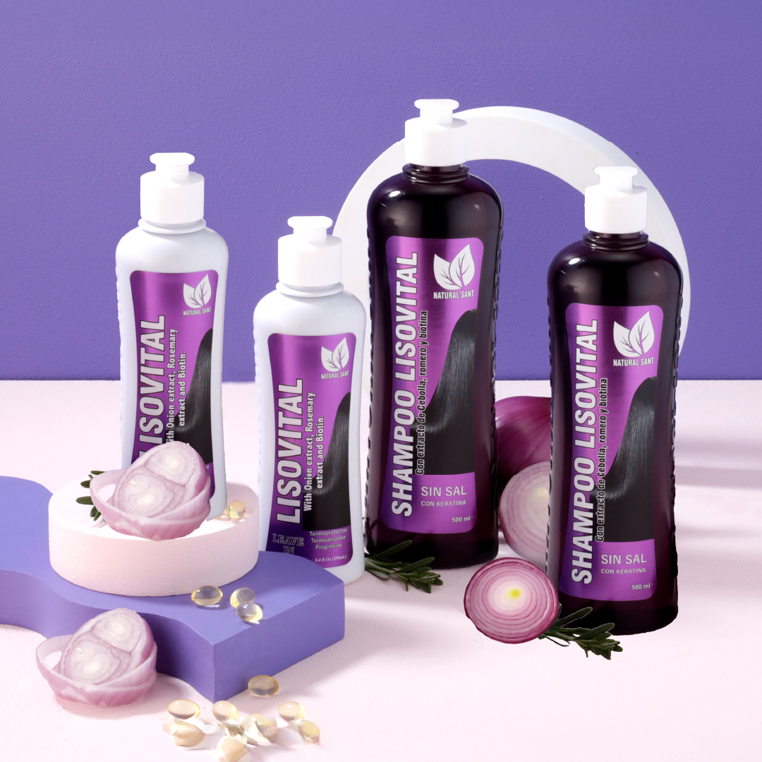 Shampoo: el shampoo Lisovital es especial para el cuidado del cabello seco y maltratado. su contenido de extractos de cebolla y romero ayudan al fortalecimiento de las hebras del cabello, ayudan a estimular su crecimiento y lo revitalizan, favoreciendo la obtención del brillo natural. Su contenido de keratina y biotina favorecen al manejo de cabellos esponjosos y facilitan el peinado.