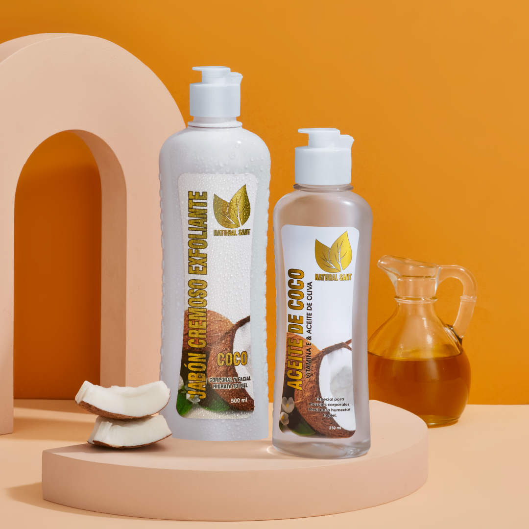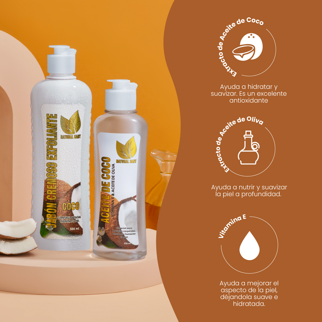 Jabón cremoso exfoliante de coco: el jabón cremoso exfoliante de coco tiene el beneficio de limpiar, humectar, hidratar y suavizar mejorando el aspecto de la piel del cuerpo y del rostro, ya que es fabricado con gránulos de cereal microprocesados que no lastiman ni irritan.