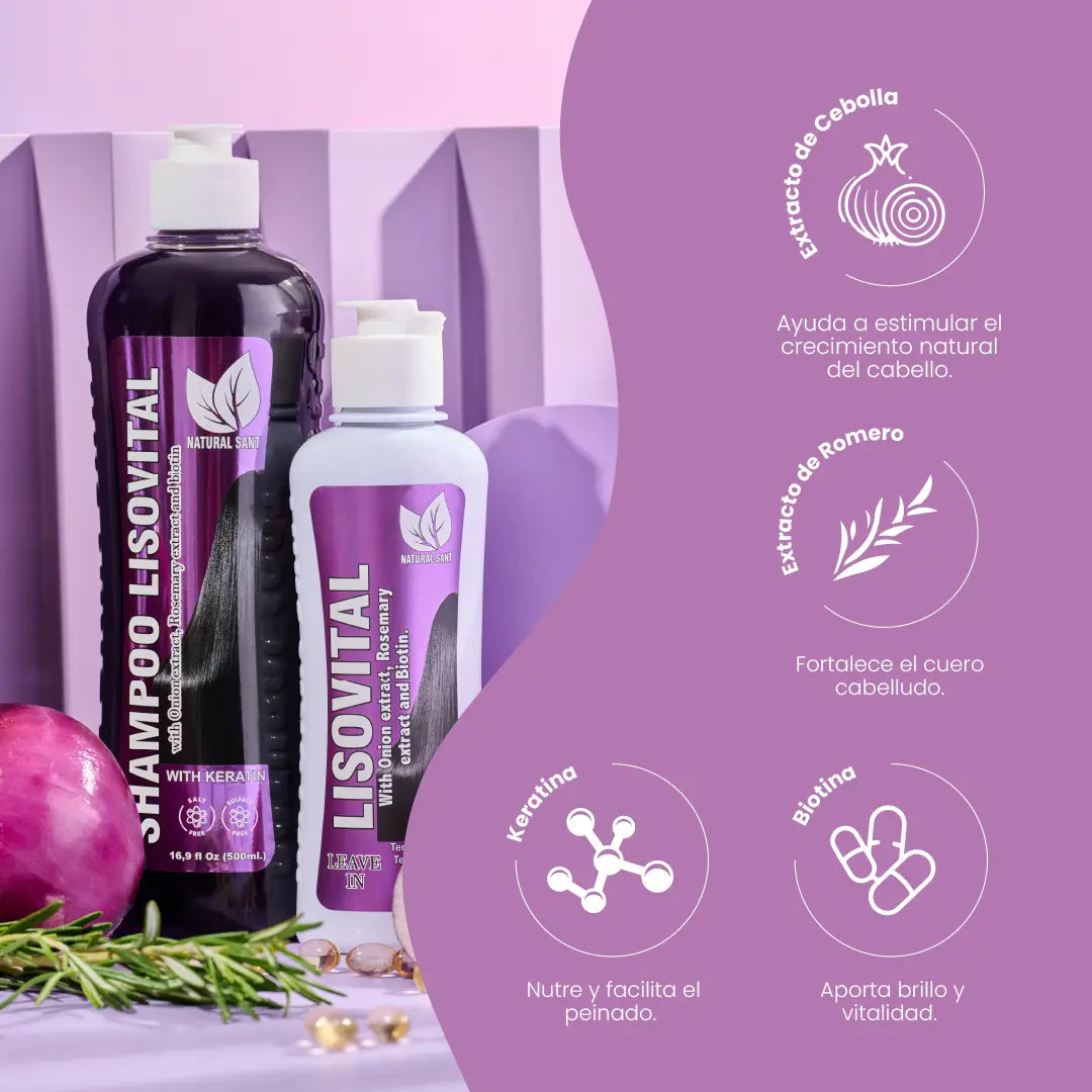 Shampoo: el shampoo Lisovital es especial para el cuidado del cabello seco y maltratado. su contenido de extractos de cebolla y romero ayudan al fortalecimiento de las hebras del cabello, ayudan a estimular su crecimiento y lo revitalizan, favoreciendo la obtención del brillo natural. Su contenido de keratina y biotina favorecen al manejo de cabellos esponjosos y facilitan el peinado.