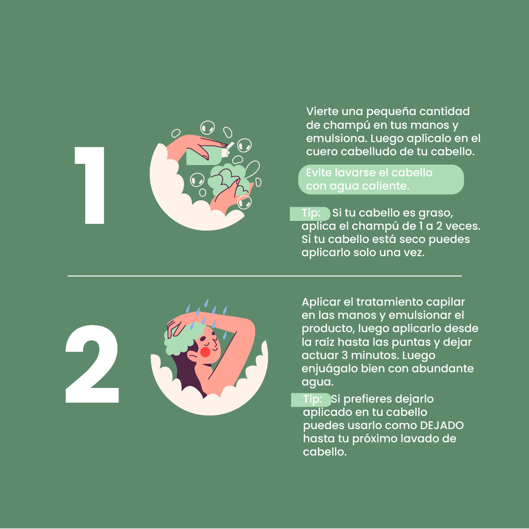 Shampoo: humedezca el cabello con agua fría y aplique el shampoo en la raíz, masajee el cuero cabelludo únicamente y enjuague con abundante agua hasta retirar de manera completa.